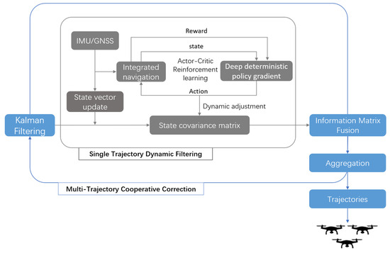 The framework adopts a “single-trajectory dynamic filtering–multi-trajectory collaborative correction” architecture. On the left is the single-trajectory Kalman filter parameter optimization process driven by the actor–critic reinforcement learning network, while on the right is the collaborative correction mechanism based on multi-trajectory information matrix fusion. By dynamically adjusting the state covariance matrix and aggregating information matrices, the framework achieves hierarchical calibration of positioning errors.