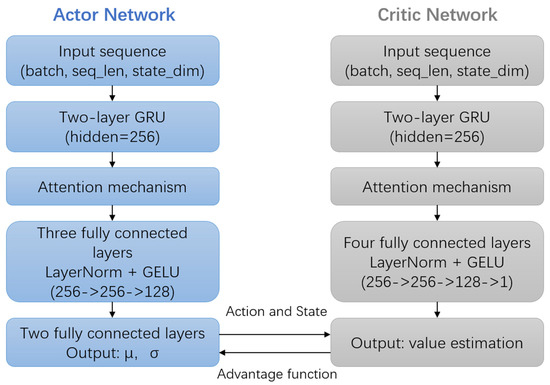 Both the actor and critic networks take the state sequence within a sliding window as input. Temporal features are extracted through two layers of a GRU, and an attention mechanism is applied to focus on key states. The actor network outputs covariance adjustment parameters (mean and standard deviation ), while the critic network outputs the estimated state value. Policy optimization is achieved through the advantage function.