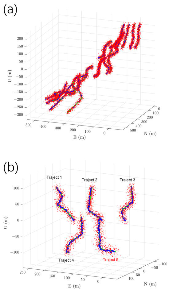 The experiments use the IMU data and GNSS signals generated by the simulation software GNSS-INS-SIM (Version 2.1), which produces IMU data and GPS signals with configurable noise characteristics (consistent with typical low-cost sensors: gyroscope (bias drift 10°/h, ARW 0.75°/ and accelerometer (bias drift 2 × 10−4 g, VRW 0.05 g/). The dataset is divided into training and testing sets, covering motion scenarios including static, uniform motion, and accelerated turns. The training dataset contains 20 trajectories covering multiple dynamic motion patterns; the testing dataset contains 5 independent trajectories not included in training, used to evaluate the algorithm’s generalization capability. Additionally, a set of real data collected by the WTGAHRS3-232 (sourced from WitMotion Shenzhen Co., Ltd., Shenzhen, China) inertial measurement module is introduced for validation, whose main parameters are accelerometer range: ±16 g; RMS noise: 0.75 1mg-rms; gyroscope range: ±2000°/s; RMS noise: 0.05°/s-rms; attitude accuracy (pitch/roll): 0.2°; GPS positioning accuracy: 2.5 m CEP50. During algorithm training, the actor–critic network uses a batch size of 20, learning rates of 1 × 10−5 for the actor and 1 × 10−4 for the critic, and a temporal window length where sequence length = 10. The Adam optimizer is used for 20 training epochs. The evaluation metric is the three-dimensional root mean square error (RMSE) of position. The effectiveness of the proposed algorithm is validated by comparing its results with those of the EKF and other methods. Figure 3 below shows the 20 training trajectories and 5 testing trajectories. Trajectories 1–4 are simulated data, while trajectory 5 is the ground truth data. Red scatter points represent GPS observations, the green curve denotes the error-free ground truth, and the blue curve indicates the estimated trajectory.