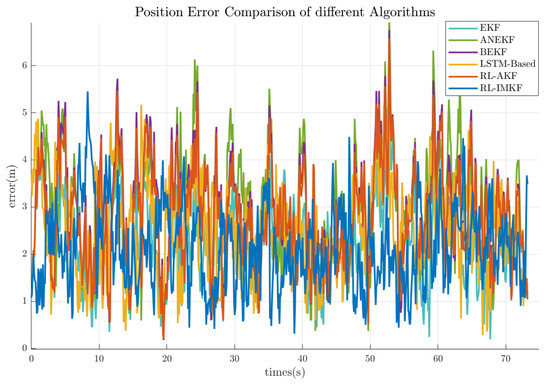 To evaluate the performance of the different filtering methods, this experiment compared the standard EKF, adaptive noise-adjusted Kalman filter (ANKF) [44], bidirectional extended Kalman filter (BEKF) [45], LSTM-based trajectory estimation algorithm [46], adaptive Kalman filter algorithm based on reinforcement learning, and the proposed RL-IMKF, where a number of trajectories M = 5 was used for the information matrix fusion. The primary comparison metric was the average position error across each trajectory. Table 1 lists the average position errors for the different filtering methods. The RL-IMKF method demonstrated the lowest error, achieving a 17.4% reduction compared to EKF. This validates that RL-IMKF improves system stability by dynamically generating covariance scaling factors through the actor–critic network. Figure 5 illustrates the positional error trends for the same trajectory under different algorithms. The RL-IMKF shows a smoother overall error curve, with both peak values and fluctuation amplitudes smaller than the methods, demonstrating a clear advantage in stability.