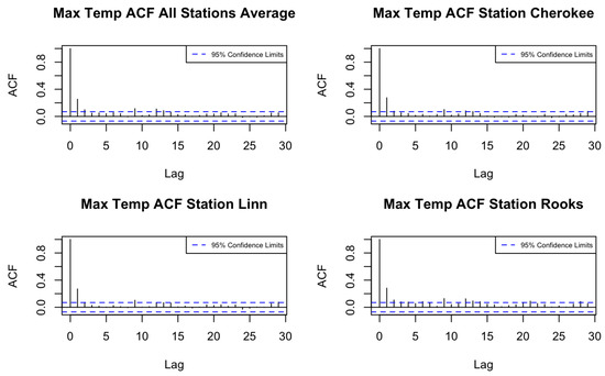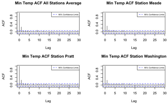 We then compute the autocorrelation function (ACF) and cross-correlation function (CCF) of the de-trended minimum and maximum temperature series across the 105 counties using the training period. Figure 1 and Figure 2 display the ACFs of average maximum and minimum temperatures for all locations, as well as for three randomly chosen stations. Based on the ACF and CCF plots, both variables exhibit a pattern consistent with a moving average process of order one (MA(1)), supporting the use of a spatio-temporal model with an MA(1) temporal margin.