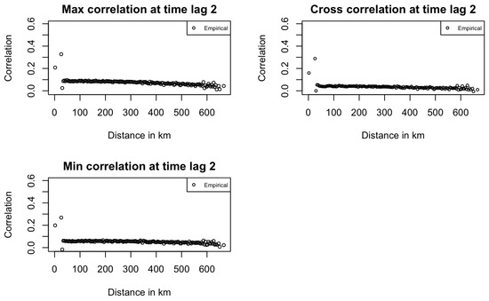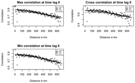 The next step is to calculate space–time correlation using detrended data, for model fitting. Since the data includes many location pairs at each distance, it is hard to extract stable spatial trends across time lags. To reduce noise, we apply spatial binning using and , which means that we average the spatial correlations within each 4-km bin and discard any empty bins. The binned correlations are the input data for further model fitting. We use the least squares optimization method to fit empirical spatial correlations for minimum temperature, maximum temperature, and their cross-correlation at lag zero. These fits provide suitable initial values for the PMM, SMM, and Cauchy models introduced below.