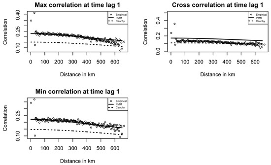 Figure 3 and Figure 4 show the fitted PMM, SMM, and Cauchy models at time lags of 0 and 1 for maximum temperature, minimum temperature, and their cross space–time correlations. In Figure 3, the PMM model fits the empirical correlations better than the SMM and Cauchy models, capturing the underlying structure more accurately. In Figure 4, for maximum and minimum temperature correlations at lag 1, the PMM better capture the correlation patterns, while the Cauchy model performs slightly better for the cross-correlation.