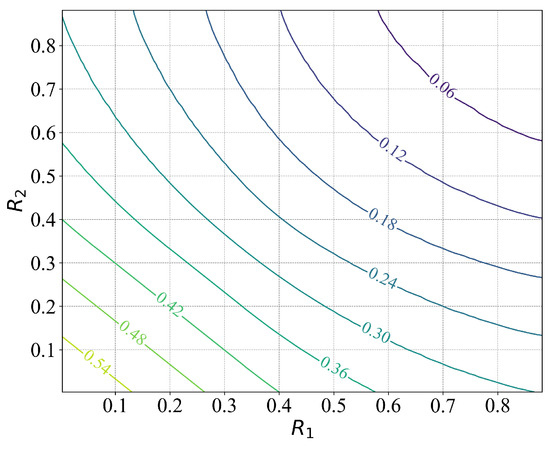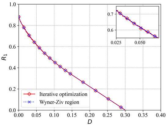The contour plot of the rate-distortion region for this scenario is presented in Figure 2, while Figure 3 displays a surface plot depicting the rate-distortion region. We note that when , the considered problem reduces to the traditional point-to-point Wyner–Ziv problem. In Figure 4, we compare the rate-distortion results computed using the proposed approach with the theoretical analysis by Wyner et al. [13]. We observe that the two rate-distortion function curves coincide, demonstrating the effectiveness of the proposed iterative approach for calculating rate distortion.
