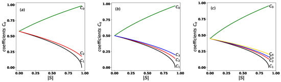 Ordering property of the coefficients from Equation (5) as a function of , shown for (a) , (b) , and (c) , with .