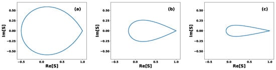 Polar graph of the inner product S. The blue line indicates the boundary , where the set of equidistant states becomes linearly dependent. Each point inside the bounded region corresponds to a specific value of S and represents a set of N linearly independent equidistant states: (a) N = 3, (b) N = 7, and (c) N = 15.