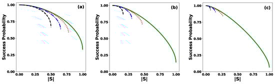 Success probability for the ME of equidistant states as a function of the modulus of the inner product for the values (solid green line), (dotted red line), (dashed–dotted blue line), and (dashed black line), for (a) , (b) , and (c) .