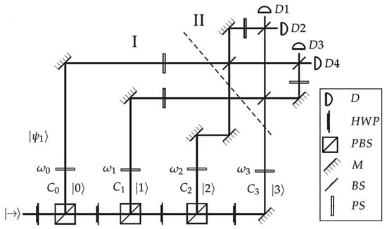 A proposal for the experimental implementation of an ME of pure equidistant states is shown in Figure 4. This scheme is similar to previously reported setups for the discrimination of symmetric states [43,44]. The first stage corresponds to the state preparation. Alice prepares and sends one of the equidistant states, say . For this purpose, a single photon with horizontal polarization enters the experimental setup. Alice can prepare any of the equidistant states by adjusting the phases in each propagation path of the photon , and by setting the appropriate rotation angles in the polarizing beam splitters to generate the desired amplitudes for each path. The prepared state then propagates through the channel. Upon receiving the state , Bob implements the inverse of the discrete Fourier transform in a four-dimensional Hilbert space. Finally, he performs a projective measurement in the computational basis . The initial single photon, after propagating through the discrimination setup, will be detected by one of the four detectors shown in Figure 4.