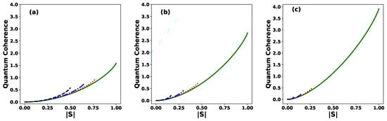 Quantum coherence of the initial state , given in Equation (33), as a function of the modulus of the inner product, for different values of the phase: (solid green line), (dotted red line), (dashed–dotted blue line), and (dashed black line) for (a) , (b) , and (c) .