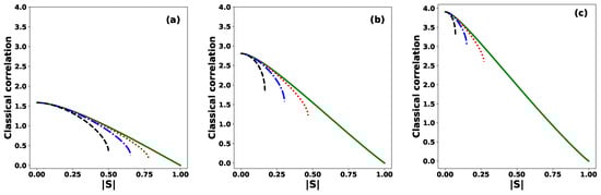 Classical correlation between Alice and Bob as a function of the modulus of the inner product, for different values of the phase: (solid green line), (dotted red line), (dashed–dotted blue line), and (dashed black line), for (a) , (b) , and (c) .