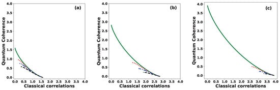 Figure 7 shows quantum coherence versus classical correlation between Alice and Bob for various values of the phase: (solid green line), (dotted red line), (dashed–dotted blue line), and (dashed black line), for (a) , (b) , and (c) . We observe that both quantities, quantum coherence and classical correlations, lie within the same range, namely . It is important to highlight here the operational interpretation of the quantum coherence as a quantifier of cryptographic randomness gain [50,51]. Therefore, for a secure and efficient protocol, we expect that Alice and Bob share a significant amount of classical correlation while maintaining sufficiently high quantum coherence. For example, when the set of states is orthogonal , the initial joint state takes the form , which exhibits a maximal classical correlation of bit but zero quantum coherence. In contrast, when the set of states is identical , the initial joint state becomes , a product state with no classical correlation but exhibiting maximal quantum coherence, equivalent to bits of randomness. Hence, Alice and Bob should choose an initial joint state that simultaneously exhibits high classical correlation and high quantum coherence. This trade-off can be optimally achieved when the phase of the inner product is and the number of states N is large.