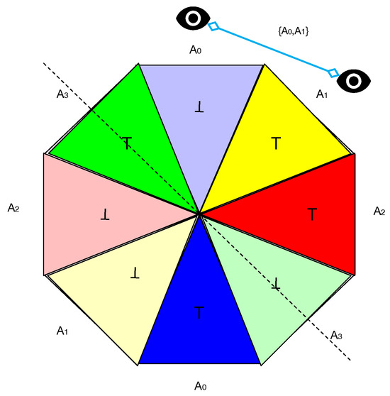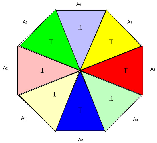 In the preceding definition, each corresponds to a facet (or color) of a coin. A measurement of yields whether the facet is dark, denoted by ⊤, or light, denoted by ⊥. Therefore, the probability p associates a context-independent probability distribution over the measurement outcomes . In other words, their measurements are “nondisturbing” [4], which is a requirement for determinations of the contextuality of a system. In addition, all sides of the coin are fair: . Finally, Equation (2) specifies that joint outcomes in a measurement context perfectly anti-correlate.