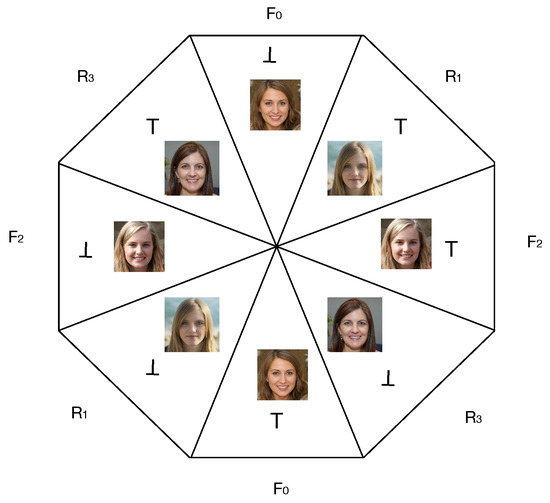 Schematic representation of a generalized coin used in the experiment, where each of the four facets of the coin is a real or fake face (instead of a color). There are four measurement contexts within which two faces are simultaneously judged, one real and one fake: . When tossed, two measurement outcomes can be observed per flip, where a measurement outcome is a judgement whether a face is fake or not .