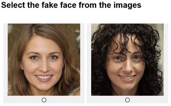The participants were instructed that they would be presented with pairs of images, in which one of the images is real and the other is fake, and that they must judge which of them is fake. Each image pair is shown side-by-side and participants were asked to indicate which of them is fake by clicking on a radio button under the image (see Figure 4). Each participant was shown 20 image pairs—10 pairs of female faces, followed by 10 pairs of male faces, making 20 judgements. After the ten female face pairs were presented, participants were asked to provide short textual descriptions of how they were making their judgments. This was repeated after the 10 male face pairs were presented.