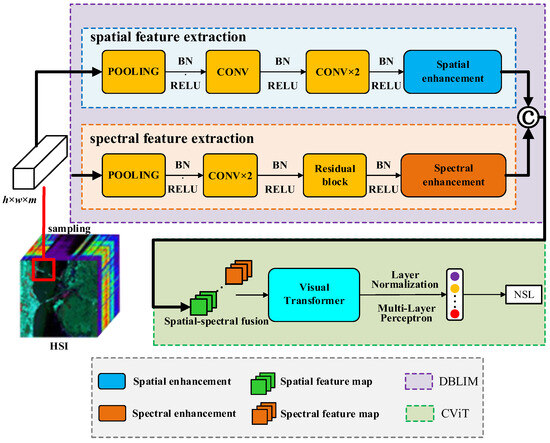 We created CWSN, a novel noise suppression HSI classification model, which aims to achieve deep extraction and characterization of spatial spectral features locally and globally, as well as mitigating the effect of noisy training sets on HSI classification. Figure 1 shows the model framework, which is made up of two modules, DBLIM and CViT, and incorporates the NSL. Since the training samples for HSI classification are usually cubic in format, several 3D cubes are randomly selected from the HSI as inputs to the CWSN, and the cubes are used as an example to illustrate the proposed network structure.