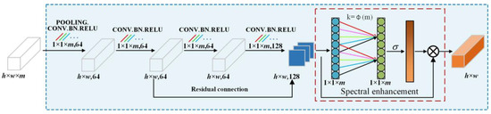 Following the residual block, the input feature is dot-multiplied with the spectral weight information to obtain the output feature enhanced by spectral features, which can discriminatively extract the spectral features while maintaining the separability between spectral information classes. The expression is as follows.