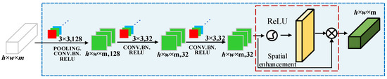 The 1 × 1 convolution cannot capture spatial context information, while a larger kernel (e.g., 5 × 5) will increase the computation and lead to over-smoothing of features. Therefore, the 2D convolution kernel size is set to 3 × 3. This setting balances the receptive field and computational efficiency, and can effectively capture local spatial features (e.g., edges, points). Next, the first layer utilizes 128 convolution kernels of size 3 × 3 to perform a convolution operation on Then, the second layer uses two convolution kernels of the same size to perform successive convolutions, and the strides are (1, 1). At the same time, the ReLU activation function is utilized to obtain the information about the spatial weights of the image with the following expression: