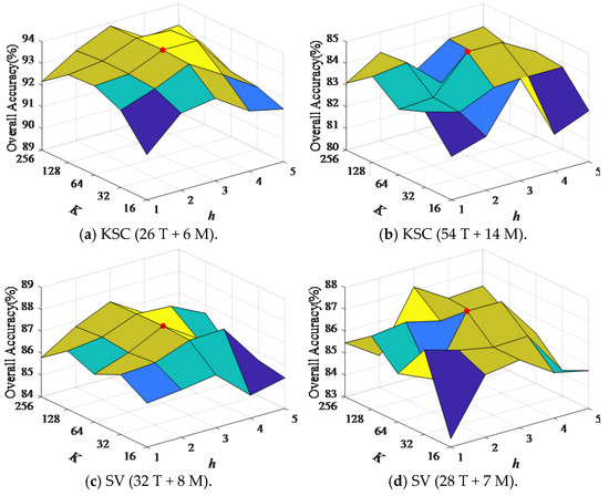 Figure 4 shows how changing the parameters K and h affects the CWSN model’s classification accuracy. Figure 4a shows that, on the KSC dataset, the OA generally increases and then decreases as the values of K and h increase, reaching the optimum when K = 64 and h = 3, indicating that the CWSN model performance is gradually optimized with changes in the values of K and h. The results in Figure 4b–d also prove that changes in values of K and h affect the performance of the CWSN model, with the optimal values of K and h being close to K = 64 and h = 3. Therefore, in this paper, based on the experimental results, K = 64 and h = 3 were set as the default parameters of the CWSN model.