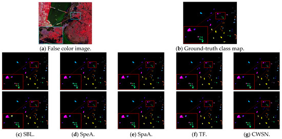 To analyze the classification effect of the different components in a more intuitive way, the regions in the image that are prone to misclassification were boxed and enlarged. Figure 5 shows that the classification effect gradually becomes better from left to right: the classification maps of SBL, SpeA, and SpaA have not only lower accuracy, but also have a large number of over-smoothing and misclassification phenomena. In contrast, the classification maps of the CWSN model, which combines all the core components, have neater and clearer boundaries within the region, indicating that the CWSN model is able to effectively extract the spectral and spatial features through the synergistic effect of the components, thus obtaining the best visualized classification effect.
