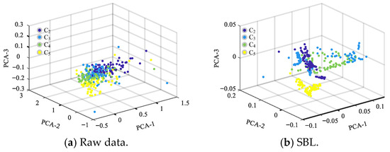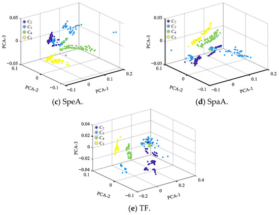 To better demonstrate the necessity and effectiveness of each component, in addition to the individual effects above, we conducted experiments on partial combinations of components. Four classes were randomly selected from the thirteen classes of the KSC dataset, and 100 samples from each class were selected for the feature visualization of each component. The four selected feature classes were C2, C3, C4, and C5. Figure 6b shows that the sample features have low interclass separability and high intraclass similarity when the feature extraction is performed on the raw data from the four feature classes using only SBL. Furthermore, when these core components are introduced progressively to the network structure, the representation of the sample features gradually improves in separability. When the TF module is added, the sample features show high interclass separability and intraclass similarity. This indicates that these core components play a significant role in improving the accuracy of feature classification. Further analysis shows that, when the TF module is introduced, its powerful feature representation and self-attention mechanism significantly improve the model’s capacity to differentiate and consistently recognize sample features, resulting in excellent visual effects.