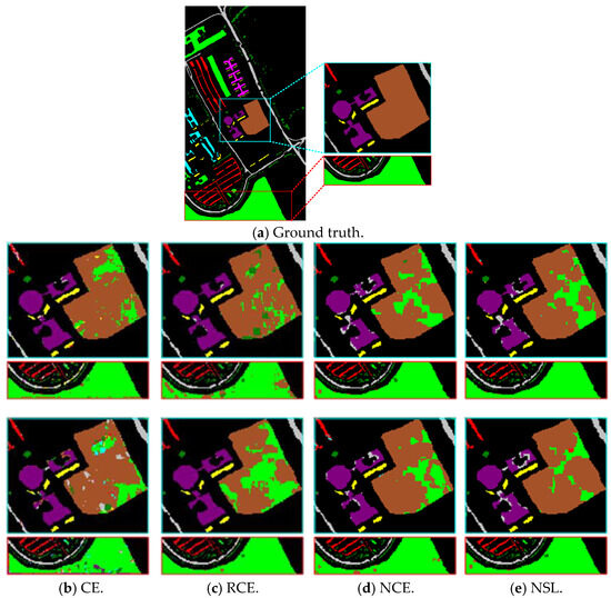 Figure 7 illustrates the qualitative classification results on UP. For the two regions boxed in Figure 7a, CE performs the worst, with a lot of pretzel noise as well as unsmooth classification. RCE and NCE outperform the CE loss function in classification and show better noise immunity characteristics. Classification is the best when NSL is employed. In summary, by weighting RCE and NCR, the NSL loss function can effectively constrain the network learning and improve the ability to classify in noisy environments.