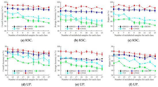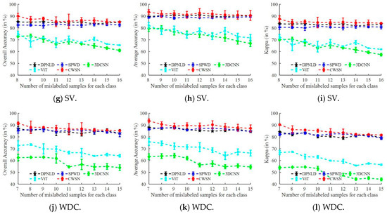 To investigate the robustness of the CWSN model under different numbers of mislabeled samples, DPNLD, SPWD, 3DCNN [49], ViT, and CWSN were compared on the KSC, UP, SV, and WDC datasets. Figure 8 demonstrates the classification accuracy of each method under different conditions. Taking the experimental results on the KSC dataset as an example, when there are five mislabeled samples, the OA, AA, and Kappa metrics of the CWSN model can reach 95%, 85%, and 90%, respectively, while the DPNLD and SPWD methods achieve 87%, 81%, and 86%, and 3DCNN and ViT are even lower, with an accuracy of less than 85%. When the number of mislabeled samples increased to 13, OA, AA, and Kappa metrics of the CWSN model decreased to 90%, 84%, and 89%, respectively, while the DPNLD and SPWD methods decreased to 86%, 80%, and 85%, and both 3DCNN and ViT fell below 65%. As the number of mislabeled samples increased from 5 to 13, the values of the OA, AA, and Kappa metrics generally fluctuated and decreased for each method, with the CWSN model having the smallest range of change. The above analysis is also supported by the experimental results from the other three datasets. In summary, firstly, the increase in the number of mislabeled samples has a negative impact on the performance of all classification methods, especially 3DCNN and ViT, due to the decrease in the number of clean labels, which can easily lead to underfitting of the deep learning algorithms. Secondly, the advantage of the interpretation effect of CWSN is obvious under different noise levels and datasets, suggesting that CWSN is better able to extract advanced features due to its hybrid multilevel network structure and can also be used to resist noise to a certain extent. In addition, the NSL loss function also plays an important role in noise suppression.