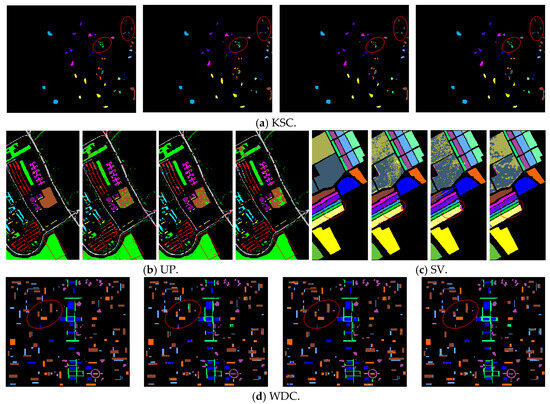Figure 9 shows the classification result maps of the three methods, 3DCNN, ViT, and CWSN, on four datasets in a noise-free environment. In the KSC image in Figure 9a, the CWSN model demonstrates its strong classification ability, which is the closest to the ground truth. In contrast, the 3DCNN and ViT methods exhibit more misclassification in the boxed region of the image, resulting in a large gap between the classification results and the ground truth. The results of the dataset in Figure 9b (UP) show that the classification results of the 3DCNN and ViT methods have a large amount of salt-and-pepper noise, whereas the classification results of the CWSN are the smoothest, and are significantly better than those of the other methods, although a small amount of misclassification still exists. The classification results of the SV and WDC datasets also lead to similar conclusions. Especially in the circled part, the CWSN model performs significantly better than the other methods, and the classification results are the closest to the ground-truth images.