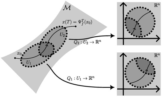 Smooth manifolds admit charts and with smooth transition maps defined on the intersection , and a collection of charts with smooth transition maps is called a smooth atlas. For examples of local charts for particular manifolds, see [49], Example 1.4, Example 1.5. A vector field assigns a vector at any point . This defines a dynamic system, also shown in a local chart with components :