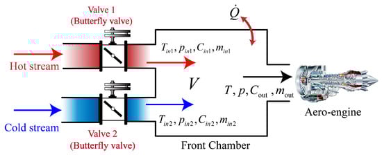 The front-chamber cavity contains two air intakes and one exhaust. The first air intake is a high-temperature airflow with temperature T in 1 , and the second intake is a low-temperature airflow with temperature T in 2 , controlled by Control Valve 1 and Control Valve 2, respectively. Because the main duct of the high-flow intake system has a large diameter (>1.5 m) and a relatively low gas velocity (<100 m s−1), the flow inside the duct can be reasonably assumed to be perfectly mixed [4,28]. Thus the dynamic characteristics of the intake pressure and temperature are