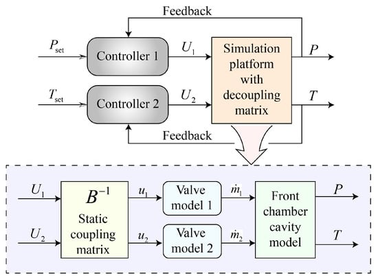To eliminate the static coupling part of the system control parameters, virtual control parameters are introduced into the system for the decoupling design. The system output and input are defined as p T T and u 1 u 2 T , respectively, where p and T are the intake pressure and temperature in the front-chamber cavity, and u 1 and u 2 refer to the control quantities of Control Valve 1 and Control Valve 2.