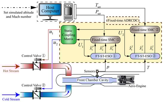 For temperature–pressure control in high-flow aeroengine inlet systems, existing research has concentrated on three main areas: (1) Robust disturbance rejection capability: During altitude tests, the inlet mass flow rate can vary rapidly—rates may exceed 30 kg s 2 . The system characteristics change accordingly, demanding control strategies that maintain excellent dynamic response and disturbance suppression over a wide disturbance range. (2) Multivariable decoupling in multi-actuator structures: High-flow conditions induce strong coupling between pressure and temperature, and rapid changes in either variable can severely degrade control performance. (3) Estimation and compensation of internal and external uncertainties: A high-flow IESS constitutes a high-order, nonlinear, and high-inertia thermo-fluid system, for which establishing an accurate mathematical model is particularly challenging. Internally, it suffers drift in valve-flow characteristics, actuator hysteresis and saturation, sensor noise, and thermal deformation and parameter perturbations in piping. Externally, it endures severe flow disturbances from the engine and environmental influences. The interaction of these uncertainties undermines the effectiveness of model-based advanced controllers [4].