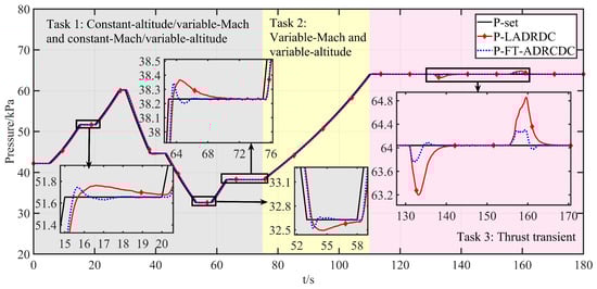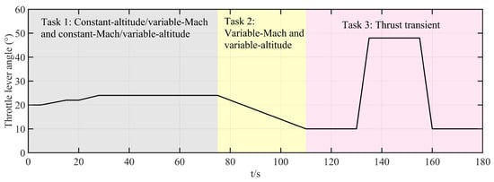 In Task 3, the throttle lever angle was pushed from 10° to a maximum angle of 48° during the 135–155 s time interval, and the flow rate of the aeroengine changed drastically, which greatly tested the anti-disturbance abilities of the designed algorithm.