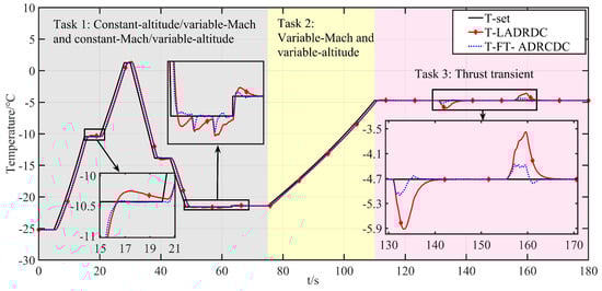 The magnified windows in Figure 10 (pressure loop) and Figure 11 (temperature loop) display every commanded step change or external disturbance applied in Tasks 1–3. Across these transients, the proposed FT–ADRDC trajectory (blue dotted curve) reaches the ± 1 % pressure band or the ±0.5 °C temperature band within 1–2 s and thereafter remains inside that band, whereas the reference LADRDC scheme (red solid curve) requires 3–8 s to achieve the same settling accuracy under identical conditions.