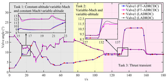 Specifically, Figure 10 and Figure 11 compare the intake pressure and temperature tracking performance of the two controllers. To quantitatively assess the results, three performance indicators are considered: the maximum absolute residual (MAR), the mean-squared error (MSE), and the absolute integral error (AIE). The MAR evaluates the peak instantaneous tracking deviation; the MSE reflects average performance by penalising squared deviations; and the AIE captures the total cumulative deviation over the mission. The computed metrics are summarised in Table 2, showing the consistent advantages of FT-ADRCDC in both pressure and temperature regulation. Figure 12 displays the corresponding actuation trajectories of Control Valve 1 and Control Valve 2. Under the current hardware configuration, all valve movements remain within feasible limits and comply with practical engineering constraints [1].