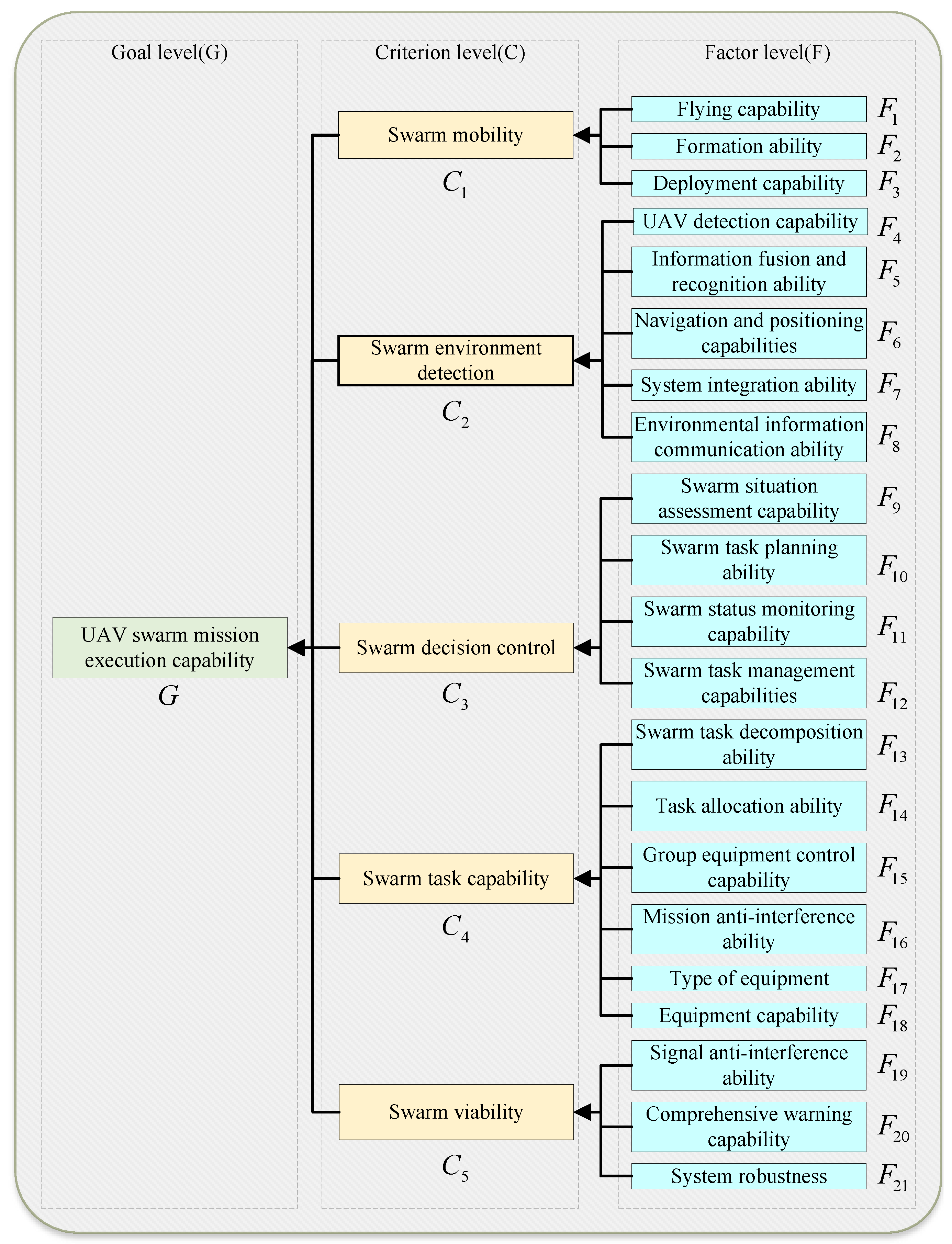 This architecture explicitly organizes the evaluation system into three distinct levels, as shown in Figure 10. At the apex is the Goal Layer, consisting of a single leaf node, G, which represents the final evaluation objective (e.g., ‘Swarm Performance’). This goal is directly influenced by the Criteria Layer, a set of intermediate nodes, , where each represents a high-level evaluation criterion like ‘Swarm Mobility.’ Finally, the foundation of the network is the Factor Layer, which contains all root nodes, . Each factor, such as ‘Path Planning Efficiency’ represents a fundamental performance metric and serves as a parent to one and only one criterion node.