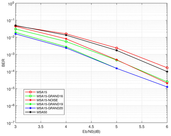 In Figure 4, the proposed schemes MSA15-GRAND continue to provide the best overall BER performance, particularly in the medium-to-high SNR region. Although the relative gains over MSA50 are smaller than those for , the improvement remains consistent and measurable. Interestingly, MSA15-NOISE shows competitive behavior in the low-SNR regime (i.e., SNR < dB), temporarily outperforming all other schemes. This indicates that in highly noisy conditions, stochastic perturbations may offer early decoding benefits. However, as the SNR increases, its performance quickly saturates and is eventually surpassed by the proposed scheme.