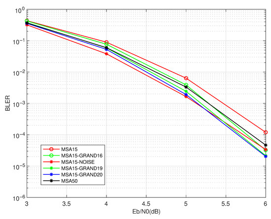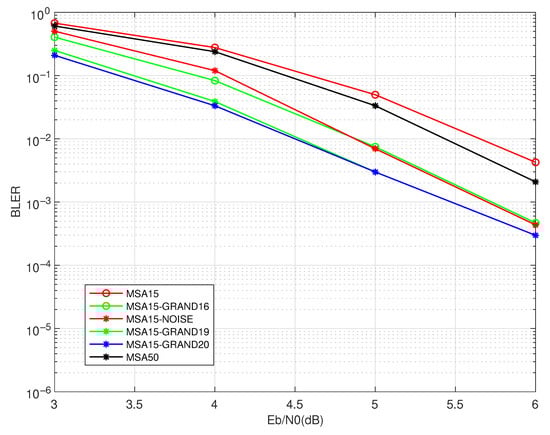 - MSA15-GRAND: The proposed two-stage decoding scheme, where the maximum number of iterations in the standard MSA is set to 15. Parameter specifies the maximum number of error patterns tested (i.e., ) in the GRAND algorithm.