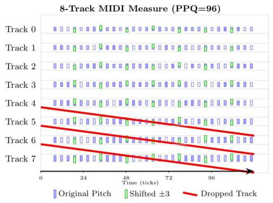 To facilitate the input of symbolic music into the model, this paper refers to MusicVAE to convert the note-level information, such as duration, pitch, start time, end time, dynamics, etc., in the MIDI file into a standardized data format. Specifically, the pitch in each MIDI file is encoded as 0-127. The intensity of the MIDI file is quantified into eight intervals, each interval representing a specific volume range. Each volume change event sets a segment, in which all subsequent note-on events will use this set volume level until another volume change event occurs. The advancement of time is represented by 96 time offset events, and each event advances the current time by one quantified time step. Twenty-four time steps represent the length of a quarter note. In addition to the 128 different instrument sounds defined by the MIDI standard, a number channel for drums has also been added, with a total of 129 program selection events. The MIDI program number is set at the beginning of each track. The model we proposed models musical segments that contain up to eight tracks, with each track consisting of a single instrument, with a globally unified clock resolution of 96 pulses per quarter note (PPQ). To address the unbalanced style distribution in the dataset, this paper adopts a data enhancement strategy. The pitch of notes is randomly offset by up to ±3 semitones. To maintain tonal consistency, offsets are applied such that resulting pitches remain within the current key scale: if a pitch after randomization falls outside the scale, it is mapped to the nearest scale tone. This ensures harmonic coherence while introducing small variations for expressive diversity, and the global dynamics are scaled by to simulate the dynamic changes in performance. To improve model robustness, we randomly discard one to two non-primary melody tracks during augmentation. Non-primary melodies are defined as accompaniment or auxiliary parts that typically exhibit lower pitch variance, sparser note density, and less dynamic variation. Using Music21, each track is analyzed for these characteristics to identify the primary melody; remaining tracks are treated as non-primary. This selective removal maintains the integrity of the main melody, as shown in Figure 1.