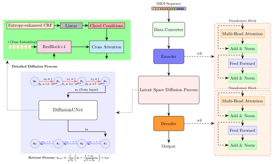 Here, denotes the event token at time step , and the decoder outputs a probability distribution over the vocabulary of discrete musical events (e.g., note-on, note-off, velocity, duration). The output event sequence is finally post-processed into a structured MIDI format using a rule-based event parser, ensuring compliance with MIDI standards. This decoder design assumes that harmonic and stylistic constraints have already been modeled in the latent space during the diffusion process. Therefore, no additional conditional input is introduced at the decoding stage, promoting architectural simplicity and computational efficiency.
