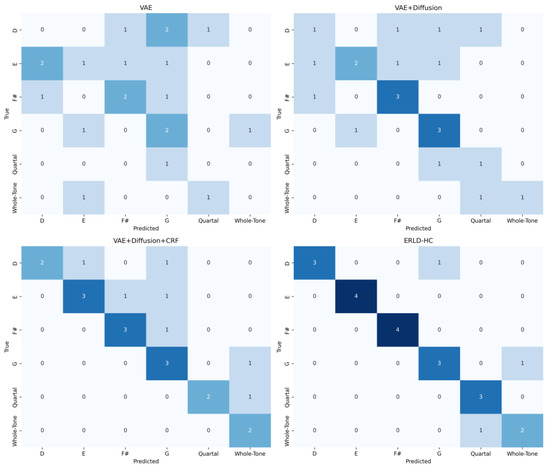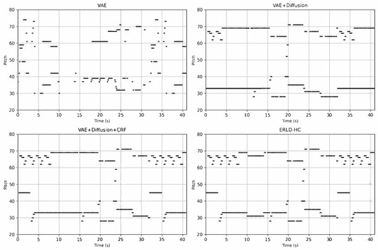 As shown in Figure 3, to prove the validity of the model we proposed, we added modules one by one to conduct ablation experiments. The baseline VAE+Diffusion model exhibits scattered and weak diagonal responses, with a mean diagonal value of 1.83, reflecting poor chord consistency and frequent misclassifications. In contrast, the VAE+Diffusion+CRF model achieves a diagonal mean of 2.5, benefiting from the introduction of global harmonic constraints in the initial stage and temporal dependencies captured by CRF.This significantly reduces illogical harmonic transitions and enhances correct chord alignment. Our model, ERLD-HC, further improves the diagonal consistency to 3.16, and effectively resolves ambiguous transitions such as D → G vs. D → F#, which are commonly confused in baseline models. Notably, ERLD-HC retains a small number of non-diagonal but musically plausible transitions such as G → Whole-Tone, demonstrating a balance between theoretical harmonic correctness and creative diversity. The confusion matrix of ERLD-HC (bottom-right in Figure 3) shows a sparse, sharp diagonal structure, while its few off-diagonal entries reflect stylistic variation rather than noise. Introducing entropy regularization into CRF inference prevents the model from being overly confident in a single chord label, reduces overfitting to deterministic chord transitions, preserves harmonic diversity, and leads to more coherent melodic variations.