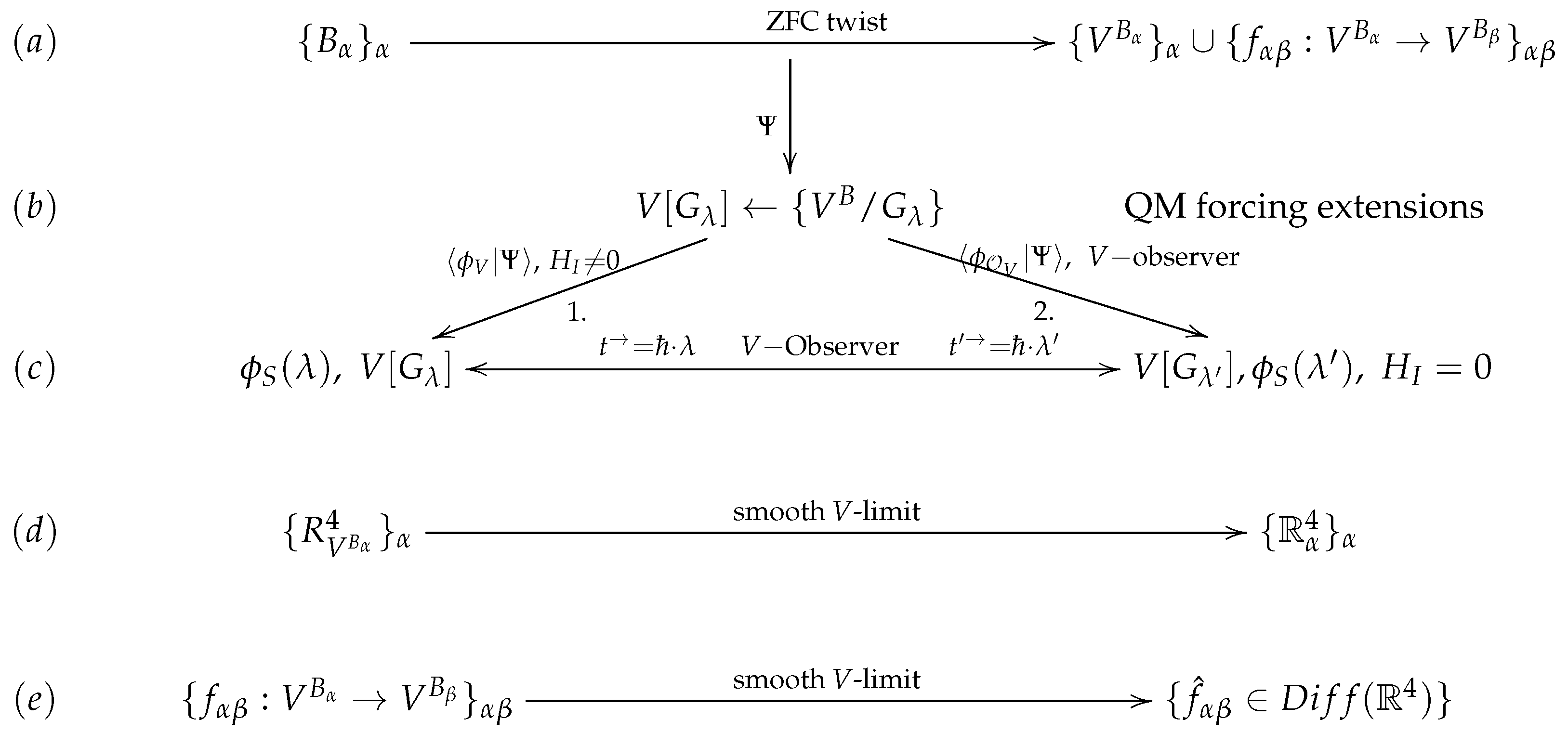 Figure 1. (a) indicates the ZFC twist that sends B to V B and B α B β to V B α V B β . Then (d,e) show the result of taking the smooth limits for the above expressions in V. These smooth V limits result together in exotic smooth R4s in V. Path 1 (b,c) corresponds to the emergence of coordinate-like time through interactions with the environment HI ≠ 0. The forcing is in the background in (b). Path 2 indicates the emergence of time via forcing of the generic measurements of the V-observer. Here, HI = 0.