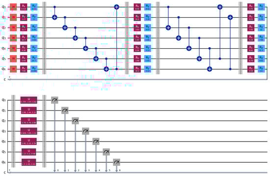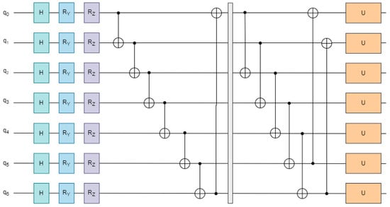 In this expression, and represent the local and global entanglement operations, respectively, while denotes the parameterized rotation gates applied at the l-th layer. This hierarchical composition enables deeper quantum transformations and improves the circuit’s ability to capture complex feature dependencies and behavioral irregularities in transaction data.