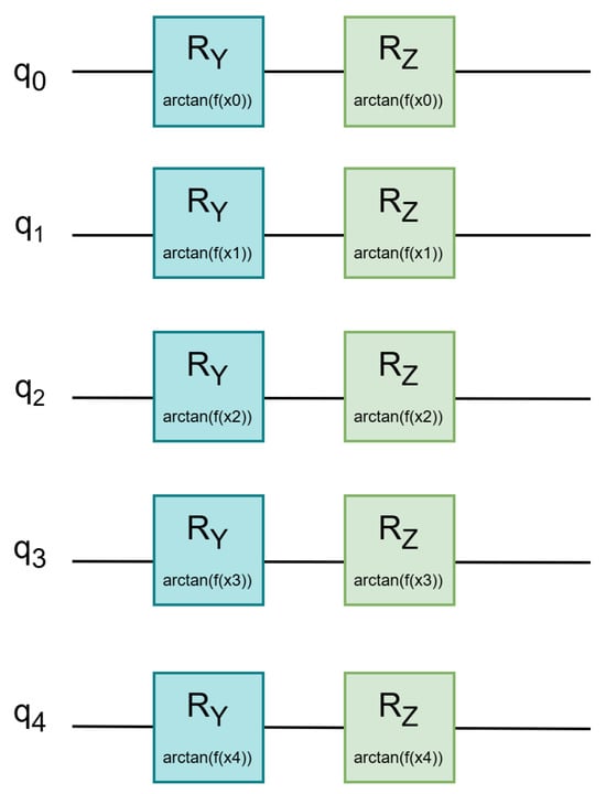 Following initialization, classical features are embedded into the quantum system using the proposed dual-angle rotation scheme. Each qubit is subjected to two sequential parameterized rotations; an gate encodes the normalized feature value along the Y-axis, modulating the state amplitude, while an gate encodes the squared value of the input along the Z-axis, introducing phase modulation. As shown in Figure 2, this structure allows for joint amplitude–phase encoding, thereby capturing richer and more nuanced feature representations within the quantum state space.