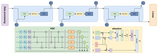 Figure 1 depicts the full architecture of the VQC module. The process begins with the initialization of classical input features as quantum states, followed by nonlinear angle encoding. These encoded states are then processed through multiple layers of entanglement and parameterized rotation gates. Finally, quantum state information is converted back into classical tensors through measurement operations. This quantum module is embedded within a unified hybrid architecture, allowing for end-to-end joint training with RNNs and attention mechanisms. The following sections provide a detailed description of the complete model architecture.