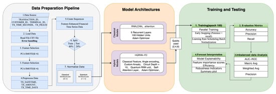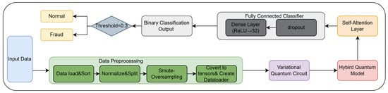 The complete HQRNN-FD workflow for financial fraud detection is illustrated in Figure 6. This end-to-end architecture includes data preprocessing, quantum feature encoding, temporal modeling with attention, and final classification. The pipeline begins with input normalization and class balancing using SMOTE [], followed by quantum representation learning through VQCs. The encoded features are then processed by a discriminative layer consisting of self-attention and fully connected components. The final prediction is produced by a threshold-based binary classifier, which identifies anomalous transaction behaviors indicative of potential fraud.