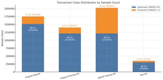 - Synthetic minority oversampling technique (SMOTE)-based strategy for class imbalance mitigation: The SMOTE is employed during preprocessing to augment the representation of minority-class (fraudulent) samples. This preprocessing step improves class balance and supports better generalization to novel fraud instances.