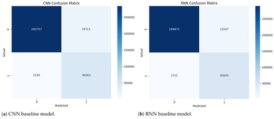 Variation in classification error distributions between normal and fraudulent transactions is clearly observed across different models (Table 5). For instance, the CNN model recorded 19,711 FP, markedly higher than those produced by the RNN (13,597) and HQRNN-FD (8110). Elevated FP rates can result in excessive rejection of legitimate transactions, leading to increased user dissatisfaction and higher manual verification costs.