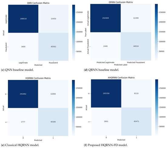 In contrast, HQRNN-FD achieves a lower FP count while maintaining a manageable number of false negatives (FN) for fraudulent cases at 1891. Although the original HQRNN demonstrates strong recall (FN = 1777), its higher FP count indicates reduced precision in detecting normal transactions.