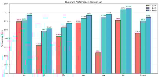 As shown in Figure 11, the monthly accuracy comparison across different qubit configurations highlights notable performance differences. The 2-qubit model consistently yields lower accuracy, particularly in February (0.9560) and May (0.9519), suggesting a representational limitation in capturing complex transaction dynamics. Conversely, the 4-qubit configuration strikes a practical balance between accuracy and quantum resource usage. Its performance in April and June closely approximates that of the 6-qubit model, indicating its stability for scenarios where computational resources are limited.