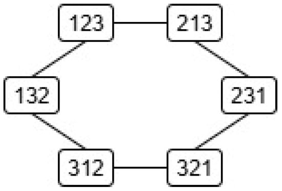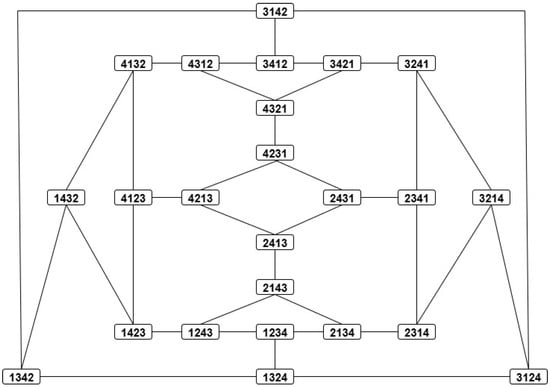Kendall adjacency graph of . A link between two nodes means that the corresponding permutations differ by an adjacent transposition, i.e., the Kendall distance between them is 1.
